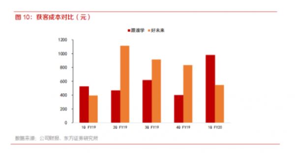 2019年Q2至Q4期间,跟谁学的获客成本最低时只有400元左右,不足好未来的一半。不过,到了2020年Q1,这一数据却飞涨至1000元左右,此时好未来的获客成本也仅为546元。另外,斑马AI课的用户超过50% 是转介绍等自然增长方式,所以综合获客成本在2000 多元。