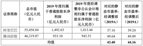 而在26日晚间公布的发行公告中,阿里巴巴和腾讯集团仍赫然出现在可比公司之列,蚂蚁集团与AT主要进行市盈率的比较——截至2020年10月23日(T-4日),阿里和腾讯的经调整前静态市盈率均值为43.40,经调整后的静态市盈率均值则为44.16。
