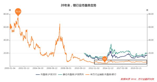 2007年前后,在银行业股改上市以及经济高速增长的驱动下,市场对银行业资产质量非常乐观,给予了过高的估值;而近几年,GDP增速放缓,银行业不良率攀升,银行业估值又被打入谷底,迟迟翻不了身。