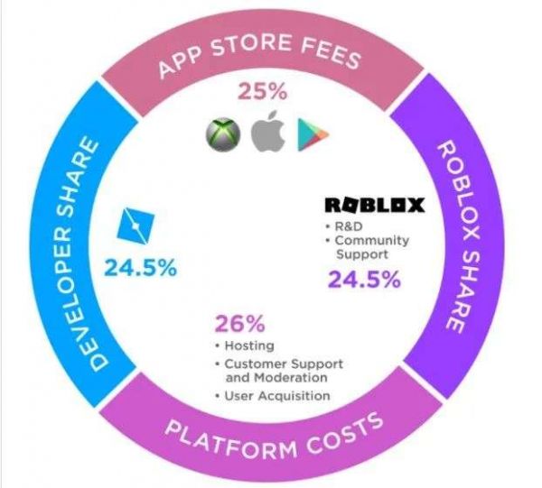 具体来说,Roblox官方收取的费用分两种:第一个是“平台成本”,即Roblox的服务器维护,因为开发者的游戏全部运行在Roblox的官方服务器上,占26%;第二个就算Roblox自己的抽成了,占24.5%。