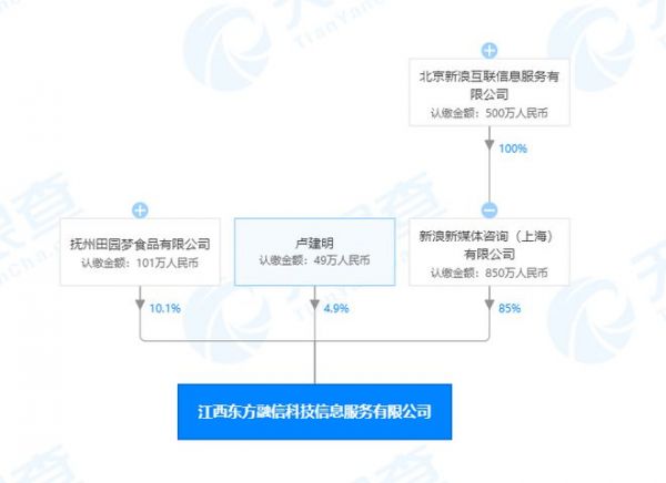 天眼查App显示,“易e贷”关联公司为江西东方融信科技信息服务有限公司,该公司成立于2014年4月,注册资本1000万人民币。经营范围含技术服务、技术开发、技术咨询、技术交流、技术转让、技术推广,财务咨询,企业形象策划,信息咨询服务(不含许可类信息咨询服务)等。天眼查App股东信息显示,该公司第一大股东为新浪新媒体咨询(上海)有限公司,持股85%,后者为北京新浪互联信息服务有限公司的全资子公司。第二大股东为抚州田园梦食品有限公司持股10.1%;自然人卢建明持股4.9%。