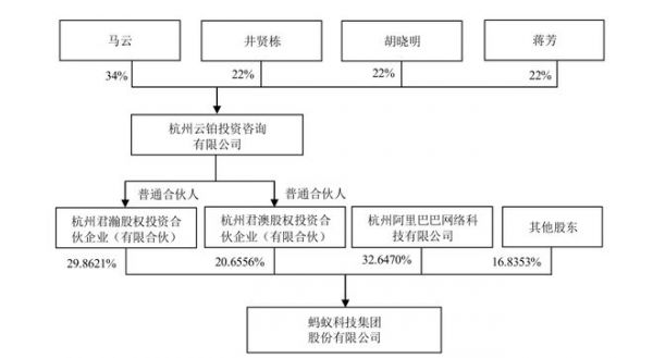 不过,马云通过旗下其他公司间接控制蚂蚁集团50.5177%的股份,为蚂蚁集团的实际控制人。