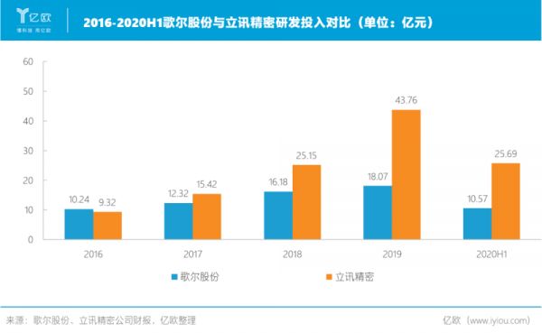 除了2017年关键卡位的慢与快,歌尔和立讯在研发投入上的多寡,或许也是造成两者差距的原因之一。