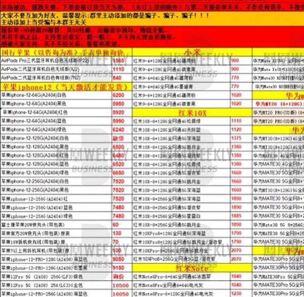 在华强北电子批发市场,王方更早感知到iPhone12的热度。不同档口报价各异,半个小时变化一次,背包客和小店主们挤在柜台前,脑袋围了几层,守着报价单,希望“蹲”个好价格。