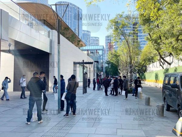 10月23日,苹果Apple官网发售首日上午,“黄牛”们聚集在北京三里屯苹果Apple直营店出口。