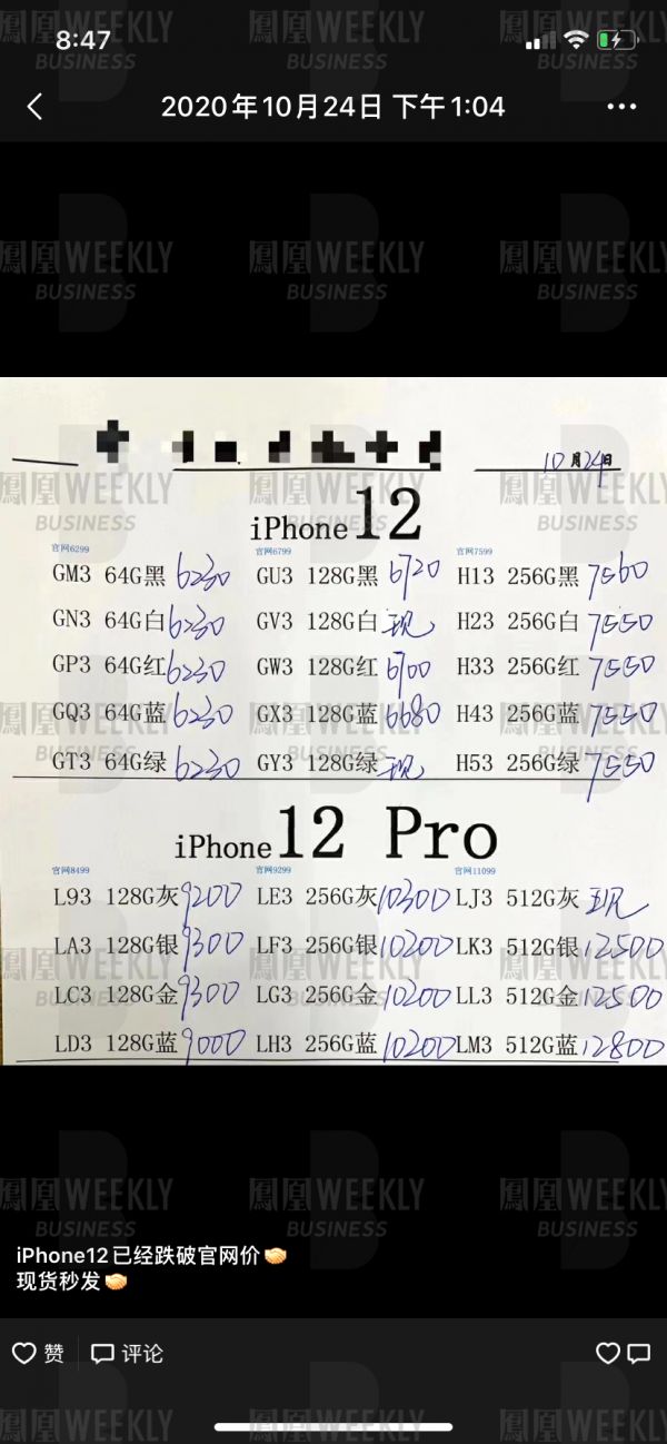 一位华强北手机店主在10月24日的朋友圈中表示,iPhone12已跌破官网价。