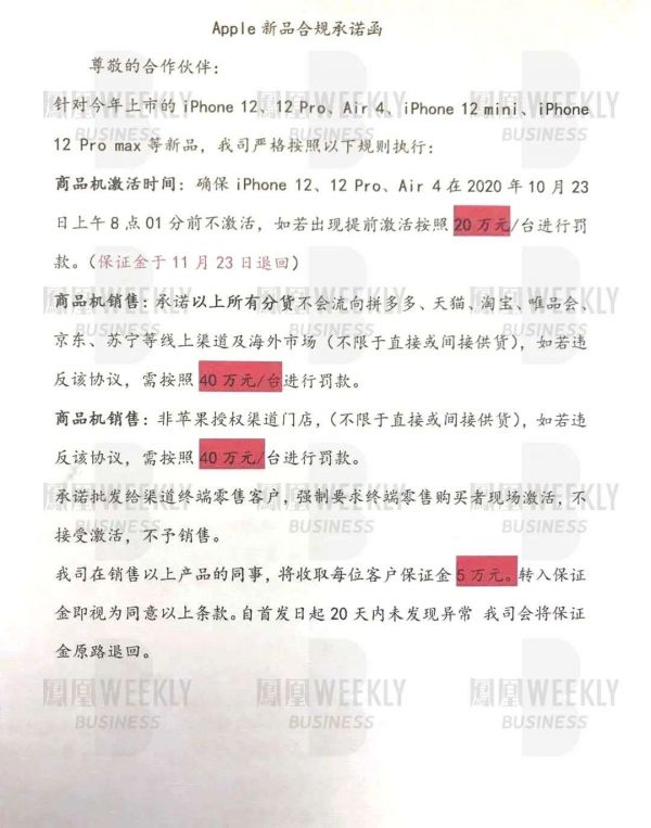 要求缘源自苹果Apple给出的《新品合规承诺函》,该函除规定“不得将产品流向上述渠道,否则每台罚款40万元”外,还要求经销商承诺,强制要求终端零售购买者现场激活,不接受激活,不予销售。函件写明此举是为了“防止有人拿走机器返回线上销售”。“规定已经实施了。”王方证实,其帮客户取货时被告知,必须当场激活才能离开柜台,否则便要交5万元的保证金。