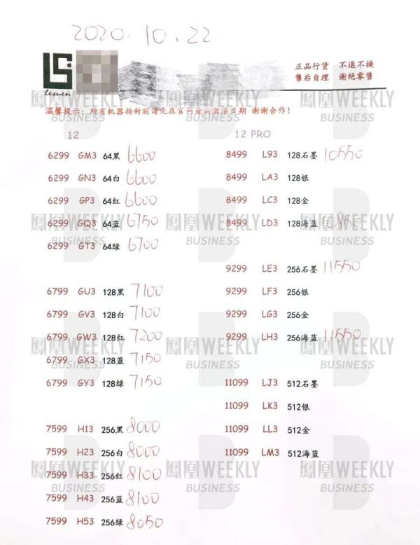 在华强北电子批发市场的一处档口,报价单下写着几行小字,特意用了红色,“新品机器不能流向拼多多、天猫、淘宝、唯品会、京东、苏宁、直播等线上渠道及海外渠道市场”,并强调“不限于直接或间接供货,如有发生,我司将追究相应责任,并要求(其)承担苹果厂家所有罚款”。