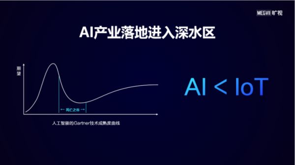 交流中,印奇分享了一组技术成熟度曲线(Gartner Hype Cycle),该曲线将新技术划分为五个发展阶段:萌芽期,过热期,低谷期期,复苏期与成熟期。而当前,AI产业在经历高峰之后,已经步入“死亡之谷”。