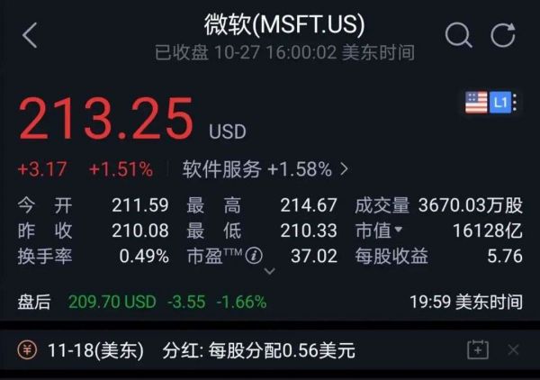 财报显示,2021财年Q1,微软实现372亿美元的营收;净利润139亿美元;调整后每股收益1.82美元。微软营收和净利均超市场预期,财报发布后,微软股价上涨1.51%,报收213.25美元。