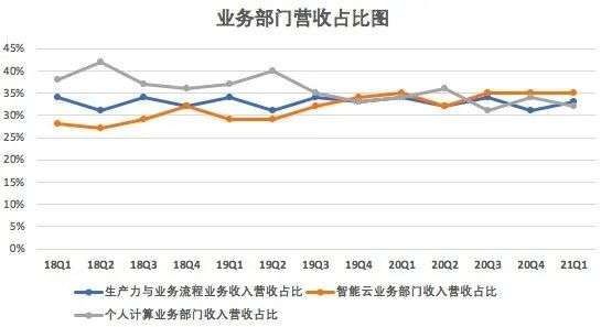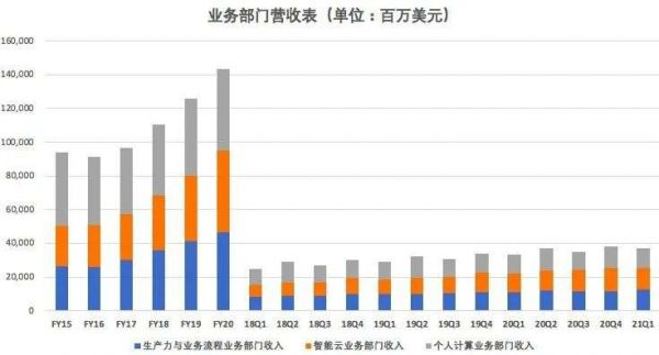 根据财报信息显示,微软的主要业务部门由生产力和业务流程业务部、智能云业务部和个人计算部门构成。