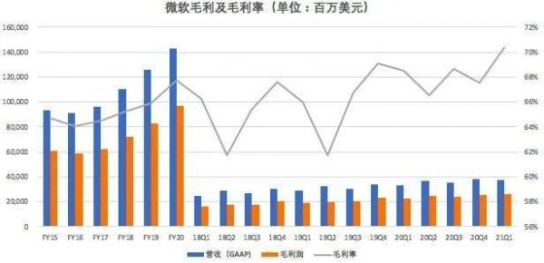财报显示,2021财年微软毛利为161.52亿美元,较上年同期的226.49亿美元,增长15%,较上一季度的256.94亿美元,增长2%。2021财年Q1毛利率为70%,自2018财年以来,创历史新高。