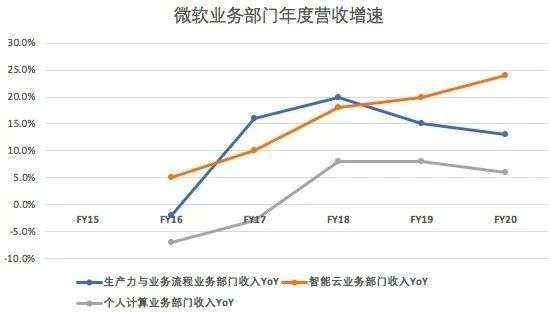 从微软FY15-FY20的年报数据来看,智能云业务是增长最快的业务。