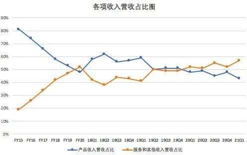 自2020财年Q4开始,产品贡献的营收逐步降低,服务和其他收入成为重要营收。