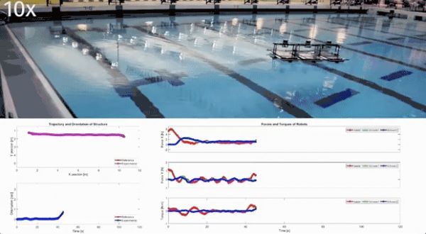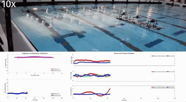 研究人员展示了10倍速下的实验过程,左侧两个坐标图显示的是结构的轨迹和方向,其中紫色和蓝色轨迹代表实验组;右侧三个坐标图显示的是机器船只的力和力矩,其中红色轨迹代表领队船只。