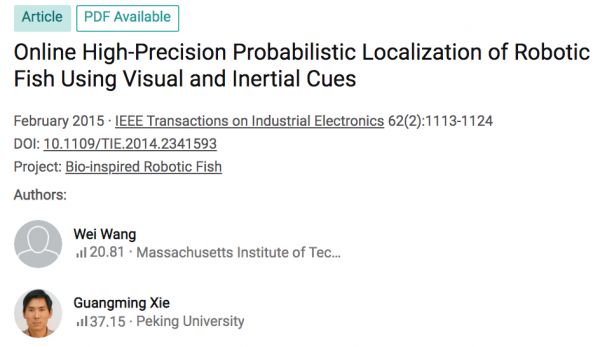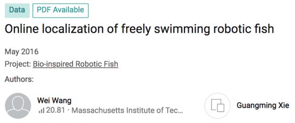 2016年,二人再次发表关于仿生机器人鱼的论文《Online localization of freely swimming robotic fish》,这也是王伟的博士毕业论文。
