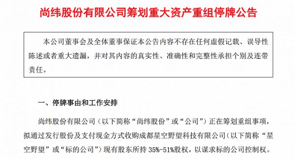 10月27日消息, 尚纬股份有限公司(下称“尚纬股份”)发布停牌公告,称正在筹划重组事项,拟通过发行股份及支付现金方式收购成都星空野望科技有限公司(下称“星空野望”)现有股东所持35%-51%股权,以谋求标的公司控制权。