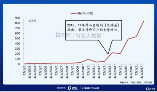 从《纸牌屋》播出的13年2月,到一年后《纸牌屋》第二季播出的前一天,奈飞的股价翻了1.5倍。