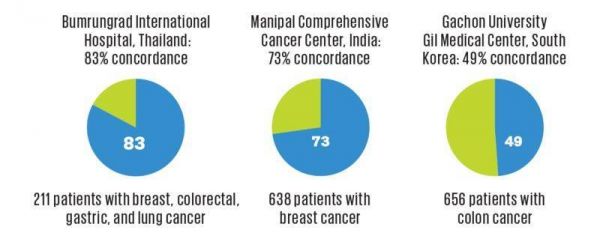 一些研究将 Watson 的癌症治疗建议与医院肿瘤学家的建议进行了比较。一致性百分比表示 Watson 的建议与专家的治疗计划相匹配的频率。