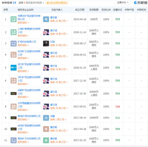 从多角度来看,以旷视科技为例,据天眼查app检索显示,有高达24条对外投资。通过投资,这些AI技术层的独角兽们可以对投资企业进行自己的技术输出,这实际上也起到了消化自身技术的作用,使得自己的技术研究看起来有更多的落地。