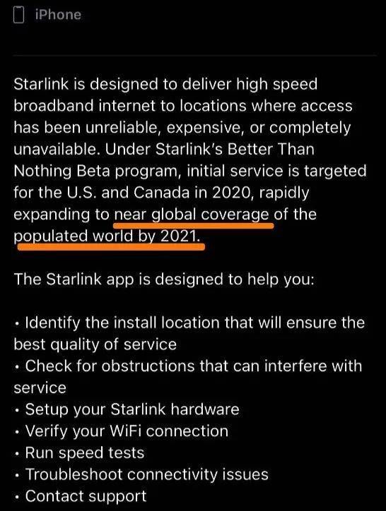 Starlink目前在轨卫星数量已经有860颗,而SpaceX的计划是在550千米左右的低地球轨道上最终拥有三万颗卫星,做到全球覆盖无死角。值得一提的是,Starlink app的下载页面上写着,SpaceX预计在2021年可以实现“在有人住的地区接近全球覆盖”:
