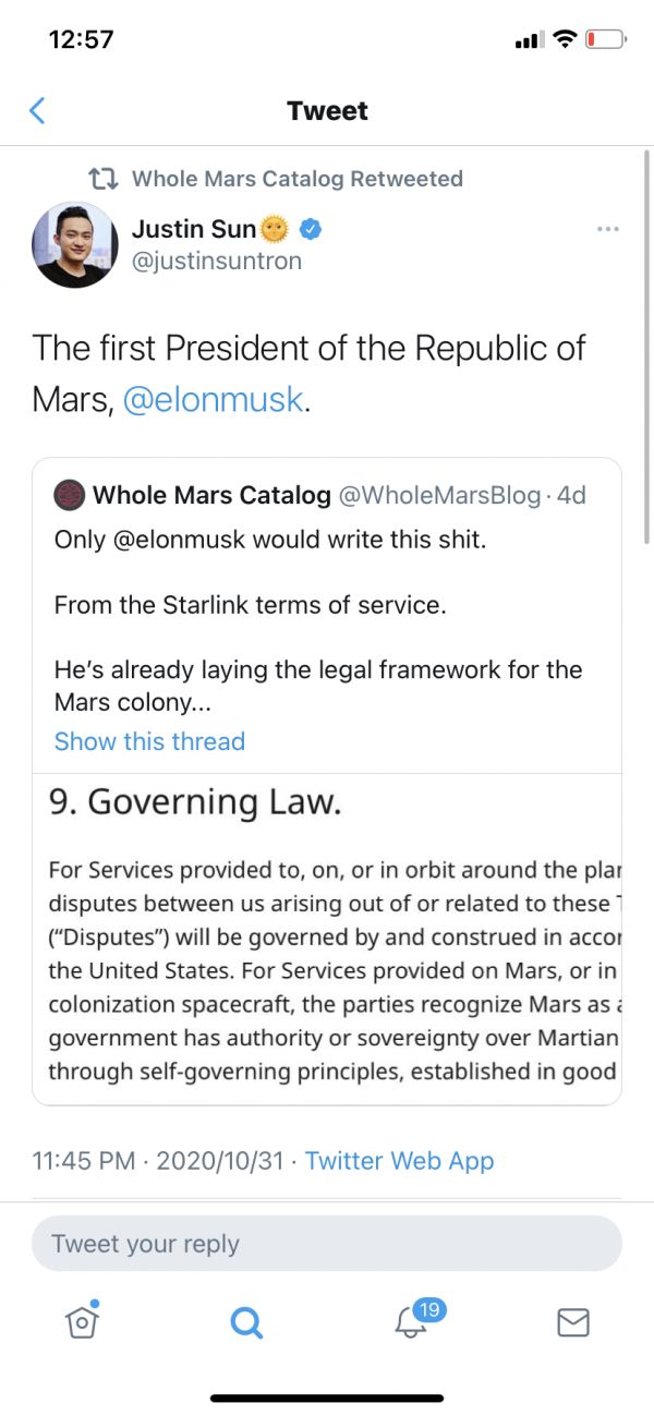 在 Whole Mars Catalog 发了 SpaceX 在火星不承认地球法律的那个 Twitter 后,和巴菲特进餐的孙宇晨转发称「马斯克,火星共和国的总统」。那么,「占道」是为了实现星际垄断,再重建一个新的国家吗?