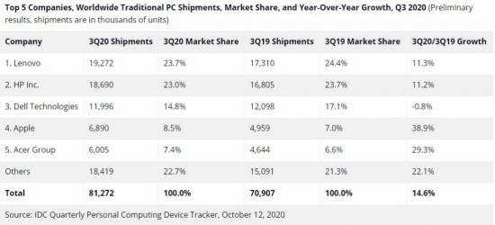 日前,IDC发布2020年第三季度的PC市场份额报告,在疫情的影响下,在线办公、在线教育等产业新模式爆发,继续推动传统PC市场销量增长,2020年第三季度全球PC出货量同比增长14.6% 至8130万台。而联想,也又一次重登出货量榜首。