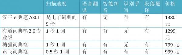 科大讯飞这次推出的词典笔基本配备了全部同类产品已有的功能,且速度和准确率上也不逊色。预计这款词典笔问世后,整个词典笔市场的技术标准将有所提高。目前,讯飞词典笔的售价定为999元,这一价格位于各大公司顶配产品价格的中间位置。
