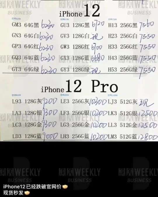 但黄牛市场的再次兴盛,也只持续了一周不到:从这两天各大经销商的报价看,iPhone 12依然没能免去“破发”的命运。在凤凰周刊的探访中,iPhone 12普通版已经较官方价低了100元以上。