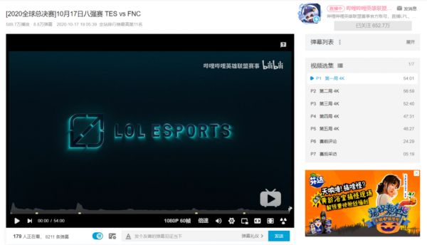 愈发浓郁的电竞氛围,以及高涨的二创热情,也离不开B站官方的因势利导。我们可以先看看一组数据:B站账号“哔哩哔哩英雄联盟赛事”的总播放量已经达到了8.9亿次、获赞数近3000万、粉丝数一路直逼700万。S10开始后,该账号会在赛事结束第一时间上传比分、战报以及赛事录像,比如TES对阵SN的四强赛,如今已经收获了近600万的播放量和9万条弹幕。