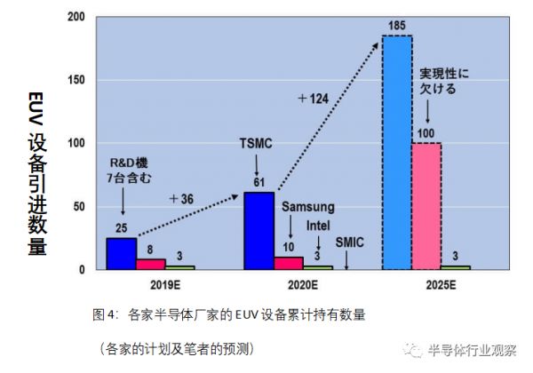 笔者认为,在ASML 2020年出货的36台设备中大部分都是出给台积电的。如果三星电子也购买了EUV设备,最多也就是1~2台(如下图4)。可以推测,在2020年年末各家厂家持有的EUV设备数量如下,台积电为61台,三星电子最多为10台左右。