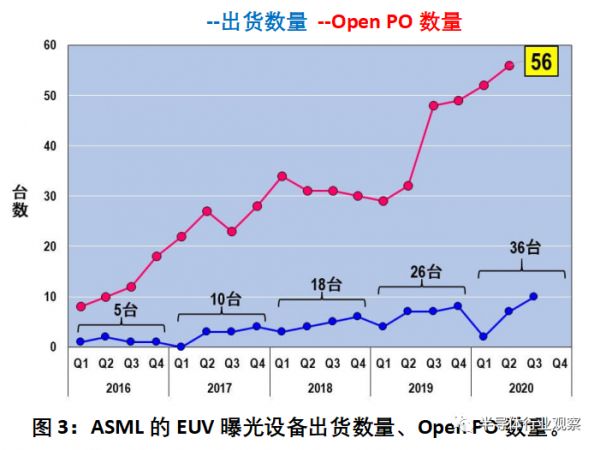 全球唯一的EUV设备生产商——ASML在2015年出货了6台、2017年10台,2018年18台,2019年26台,预计2020年出货36台。然而,Open PO数量在不断增长,在2020年的第二季度已经达到了56台。