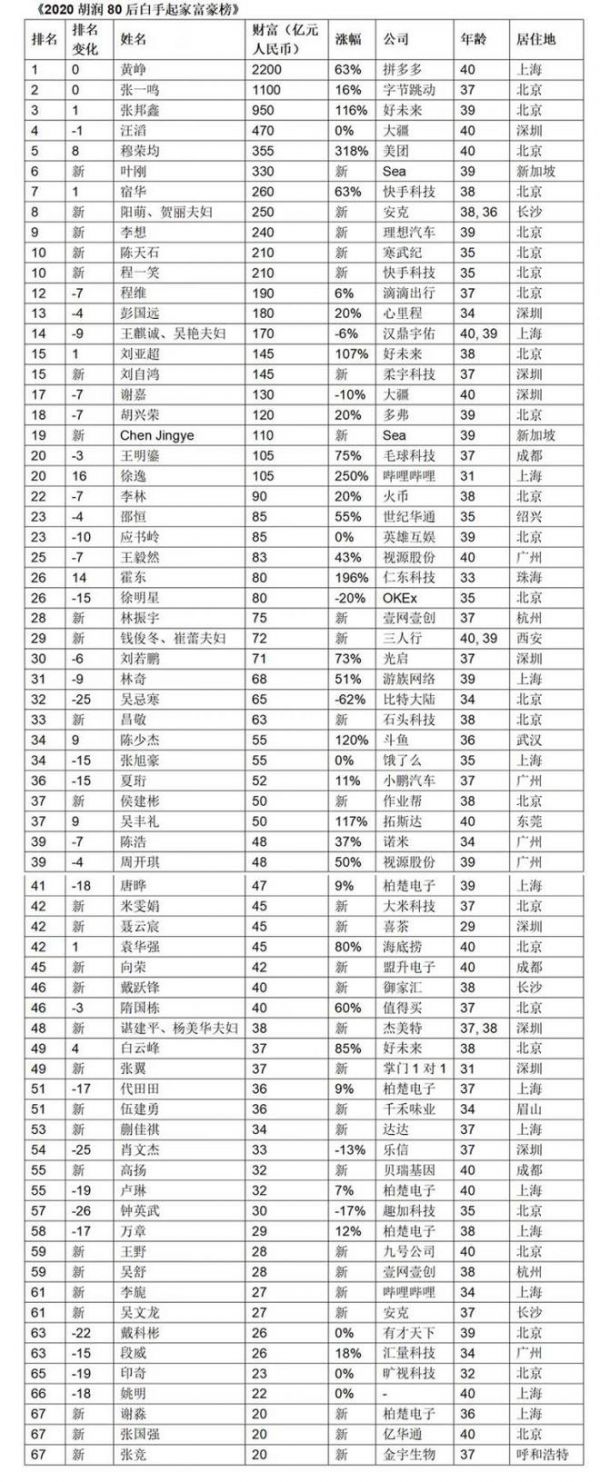 (原标题:80后白手起家富豪榜: 平均年龄37岁 拼多多黄峥身价2200亿成首富)