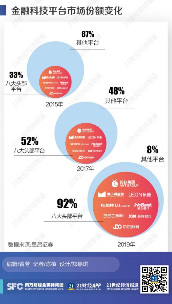 里昂证券最新报告显示,随着监管趋严导致近年大量中小型金融科技平台离场,上述八家头部平台的市场份额持续攀升。2015年这八家平台的市场份额仅有33%;2017年这个数字达到52%;2019年则飙升至92%。