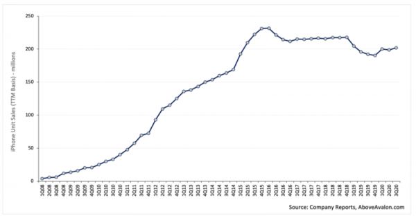 iPhone 12系列的销售火爆,让不少投资者看见了苹果重回销量顶峰的希望。据统计网站Above10月26日发布的最新数据显示,iPhone 近年来的销量不断走低,其销量最高峰停留在了2015年。