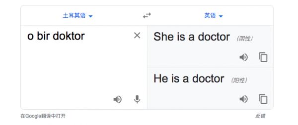 土耳其语的「他」和「她」没有性别的区分,统一用 O 表示。过去 Google Translate 在翻译 o bir doktor(ta 是一位医生)和 o bir hemşire(ta 是一位护士)时,会把前者翻译成 He is a doctor,把后者翻译成 She is a nurse,只因为机器在学习数亿数据和某些「社会规律」之后,「偏向」把医生男性化,护士女性化。