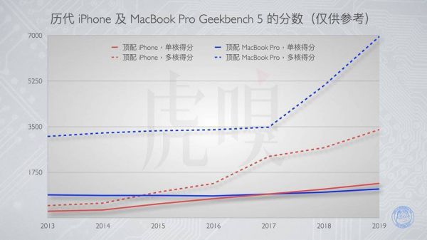 而同样是这段时间,iPhone 使用的苹果自家 A 系列新品啊,单核性能增加了整整 5 倍,直逼 Intel 芯片,多核性能增加了 6 倍。