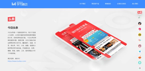 其官方网站“我们的产品”列出了11款产品,其中从上到下分别为——今日头条、抖音、抖音火山版、西瓜视频、懂车帝、Gogokids、皮皮虾、飞书、番茄免费小说。
