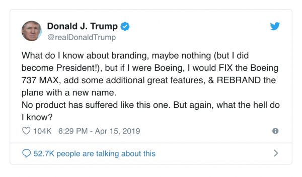 特朗普写道;“我对品牌懂什么呀,可能什么都不懂(但我当上了总统!)。如果我是波音公司,我会解决波音737MAX的问题,增加一些新的性能,然后重新给这个机型取个新名字。没有哪款产品承受过像737 MAX这样的损失。但话说回来,我又懂什么呢?”