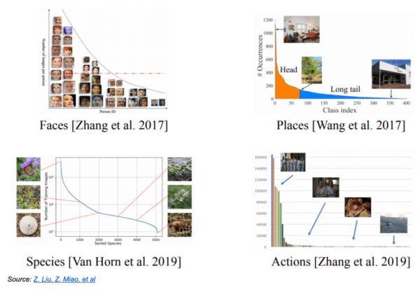 有一点已经越来越明显,长尾分布在机器学习里面也非常普遍,这是现实世界情况以及典型的数据收集实践的反映。比方说,以下图表展示了几个流行的AI研究数据集里面模型类别的出现频率。