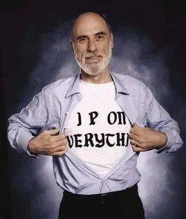 总是西装三件套的Cerf给人”科技绅士“的印象,其实他也有件著名的T恤,上面写着一句双关语 “I P on Everything”……