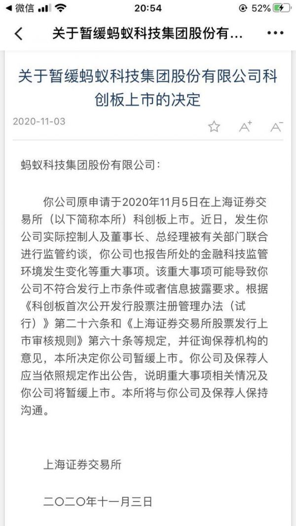 上交所:暂缓蚂蚁科技集团股份有限公司科创板上市