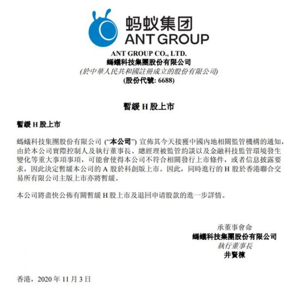 蚂蚁集团宣布,香港上市暂缓,将尽快公布细节,包括暂缓H股上市及退回申请股款的信息。
