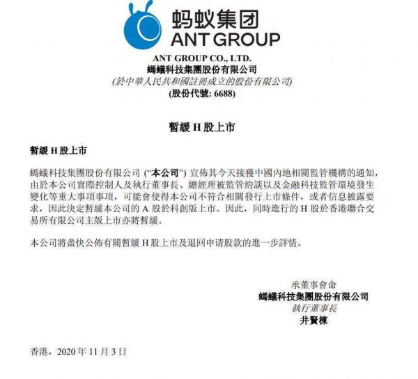 就在上交所公告发布后大约五十分钟,港交所也发布公告称,暂缓蚂蚁集团H股上市,并表示将尽快公布有关蚂蚁集团暂缓H股上市及退回申请股款的进一步详情。