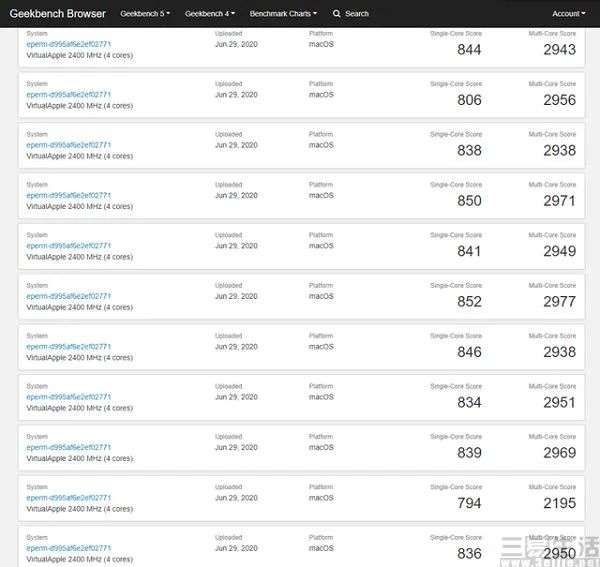 此前,苹果在WWDC后已经给开发者提供了搭载了A12Z与16GB内存的改装版Mac mini,也就是“Developer Tools Kit(DTK,开发者过渡套件)”,得以让我们一窥其在ARM架构下桌面级处理器的能力。根据开发者对DTK进行的基准测试成绩来看,其在Geekbench 5的单核成绩普遍在794-844之间,多核则在2580-2960区间,而作为对比,同样搭载A12Z的iPad Pro单核可达1118,多核则为4625。