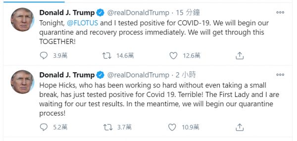 ● 10月2日,特朗普发推称他与第一夫人梅拉尼娅确诊新冠 / Twitter