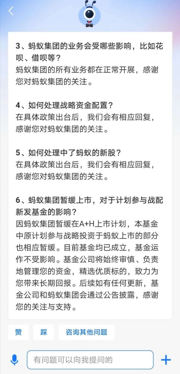 蚂蚁集团上市按下暂停键后,投资者普遍关注对计划参与战略配售的基金会产生哪些影响。对此,支付宝官方客服回应称,因蚂蚁集团暂缓在A+H上市计划,战略基金中原计划参与战略投资于蚂蚁上市的部分也相应暂缓。目前基金均已成立,基金运作不受影响。