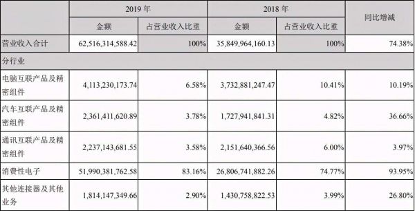 在其所发布的2019年年报中可以看到,消费性电子板块营收约520亿元人民币,占据全年度总营收的83%。而剩下的17%,则由上游元器件业务所组成。
