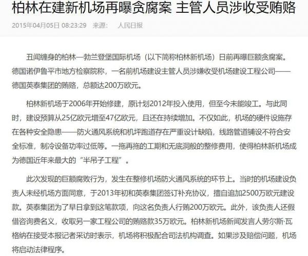 美国纽约时报评论称,柏林新机场的工程错误问题、腐败丑闻以及相关的法律诉讼侵蚀了德国自称的“效率与善治的典范”形象。
