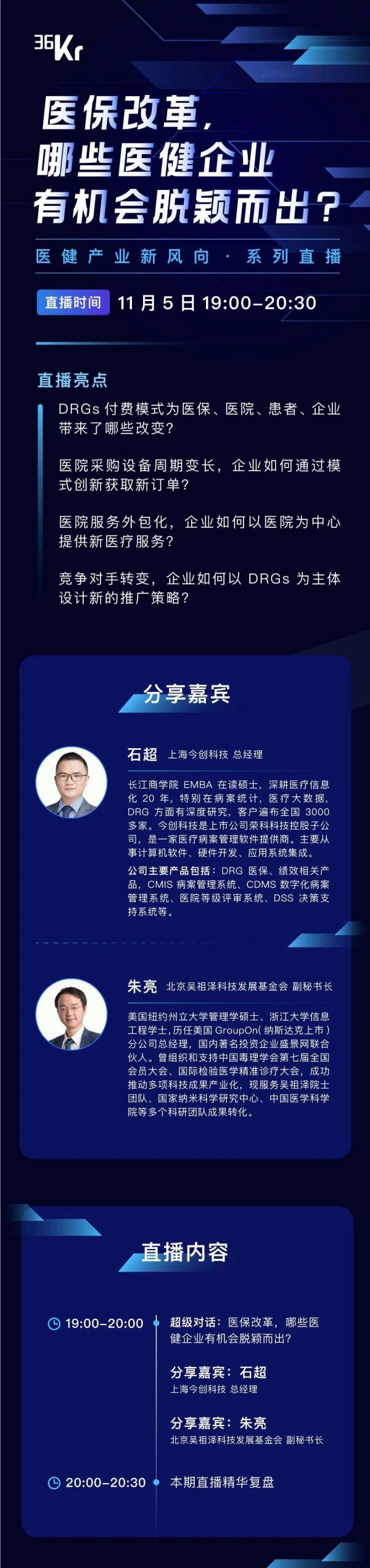 这是36氪“医健产业新风向”系列直播的第二场直播,我们邀请到了上海今创科技总经理 石超、北京吴祖泽科技发展基金会副秘书长 朱亮共同为我们解读即将在2021年全面推广的DRGs付费体系,将为医疗健康行业的创业者们,带来什么样的机会。